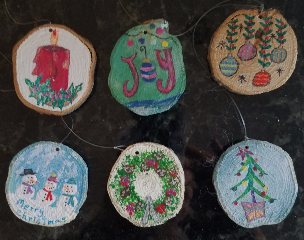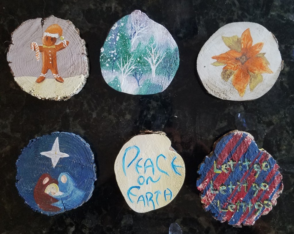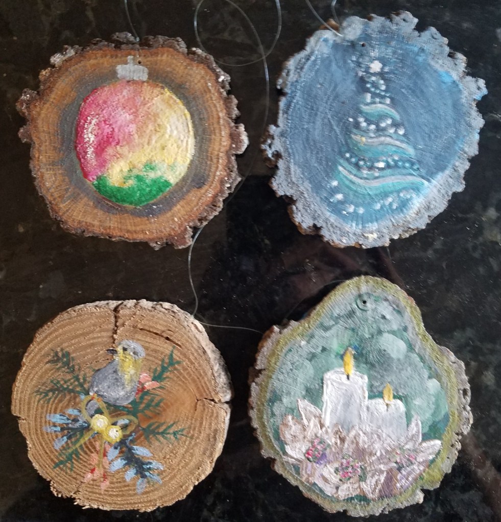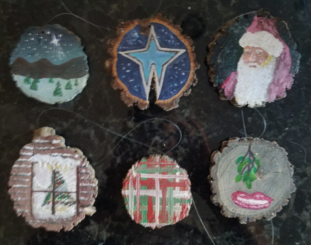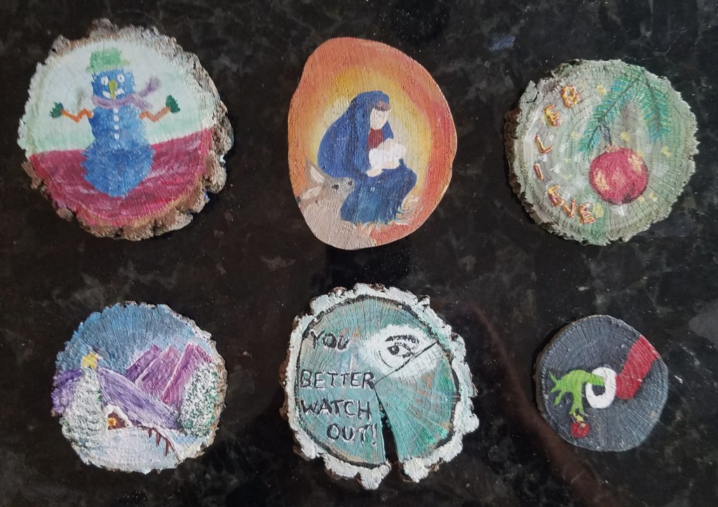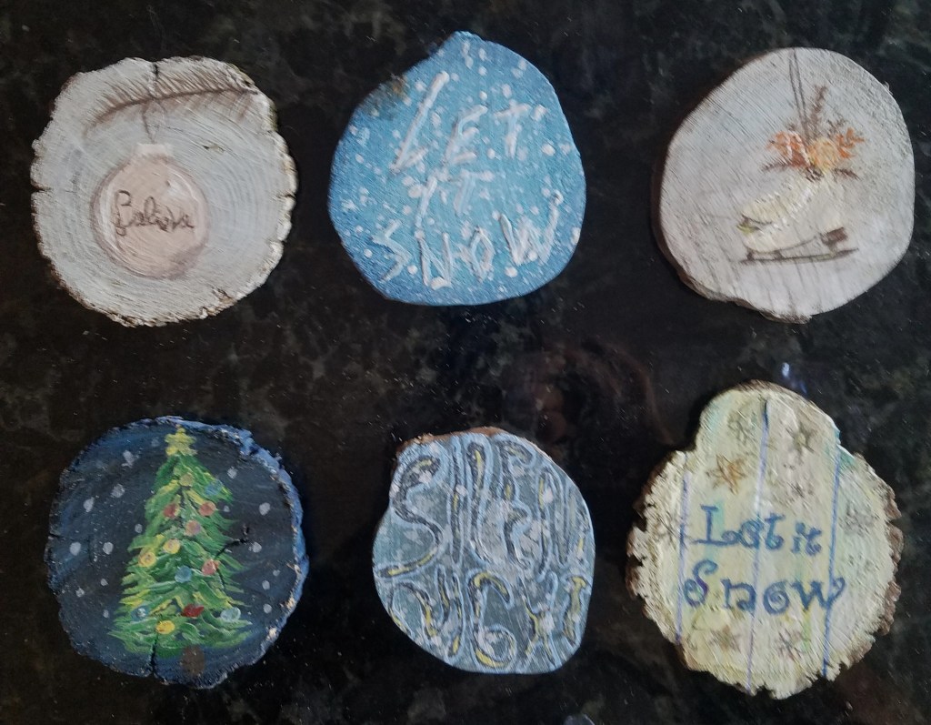 One of my favorite painting activities. I love painting on wood slices because it’s relatively quick, the theme is already set and they actually get to be displayed! And … it’s never-ending … (p.s. the pictures aren’t the best – I’ll take new pix when they get unpacked for the next holiday season).