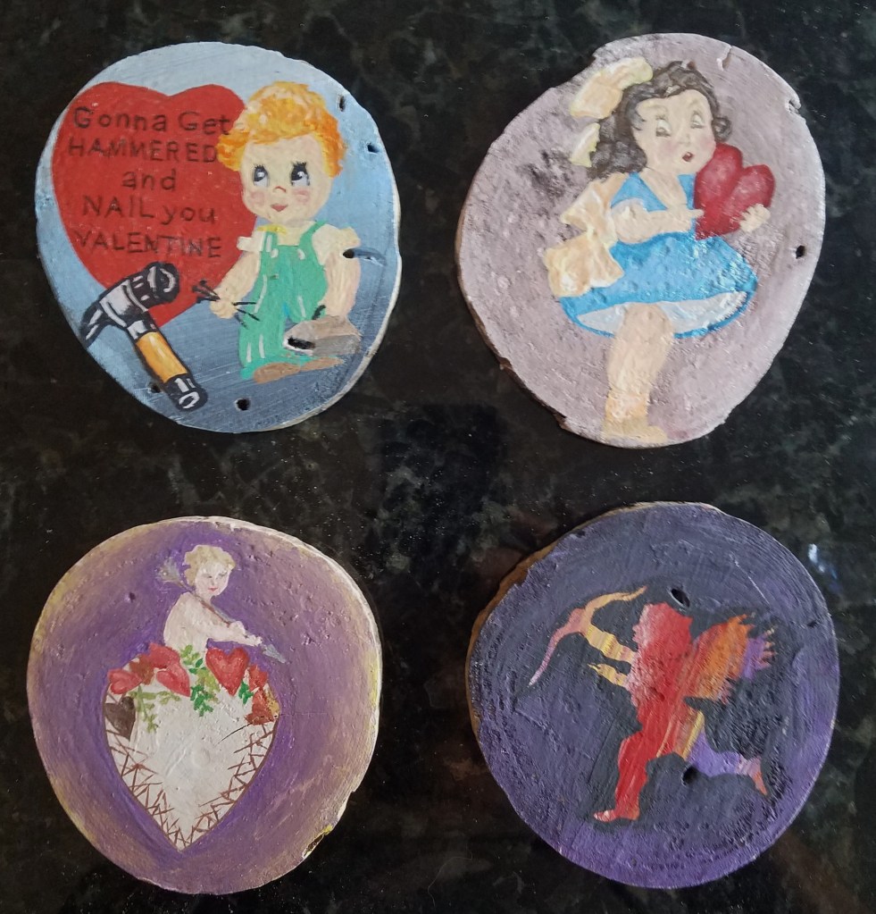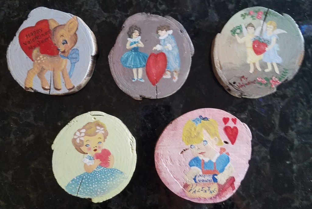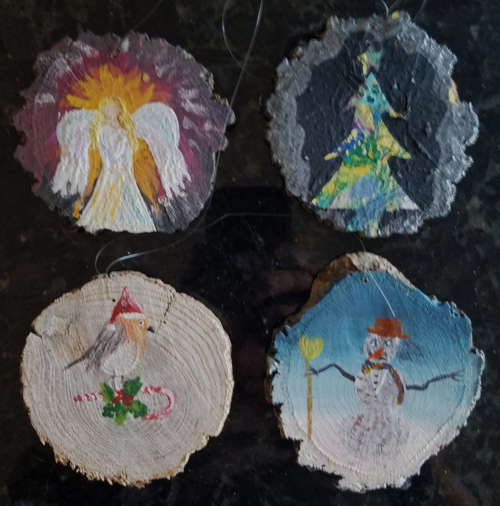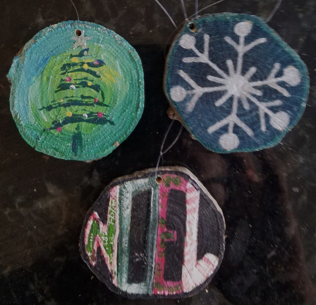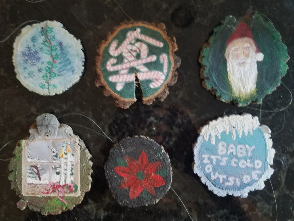 One of my favorite painting activities. I love painting on wood slices because it’s relatively quick, the theme is already set and they actually get to be displayed! And … it’s never-ending … (p.s. the pictures aren’t the best – I’ll take new pix when they get unpacked for the next holiday season).